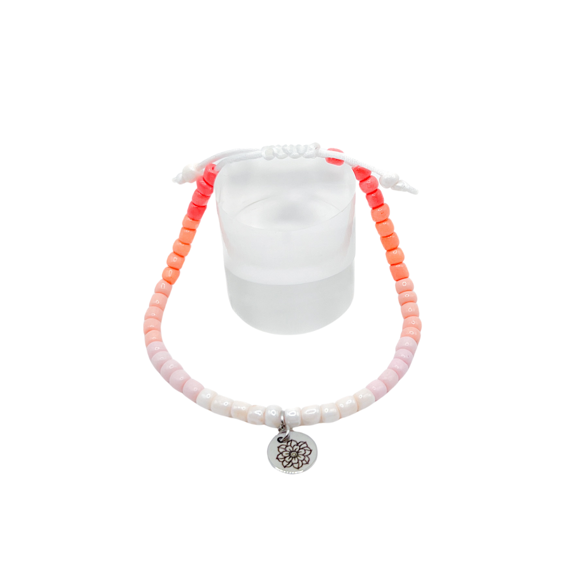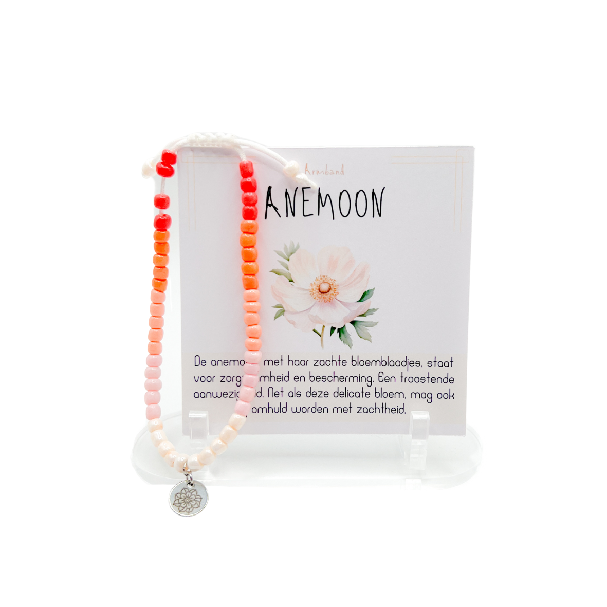 Deze armband, met haar zachte nude/oranje kralen en satijnen lint, draagt een bedel met een anemoon — een bloem die staat voor zorgzaamheid, bescherming en troost.