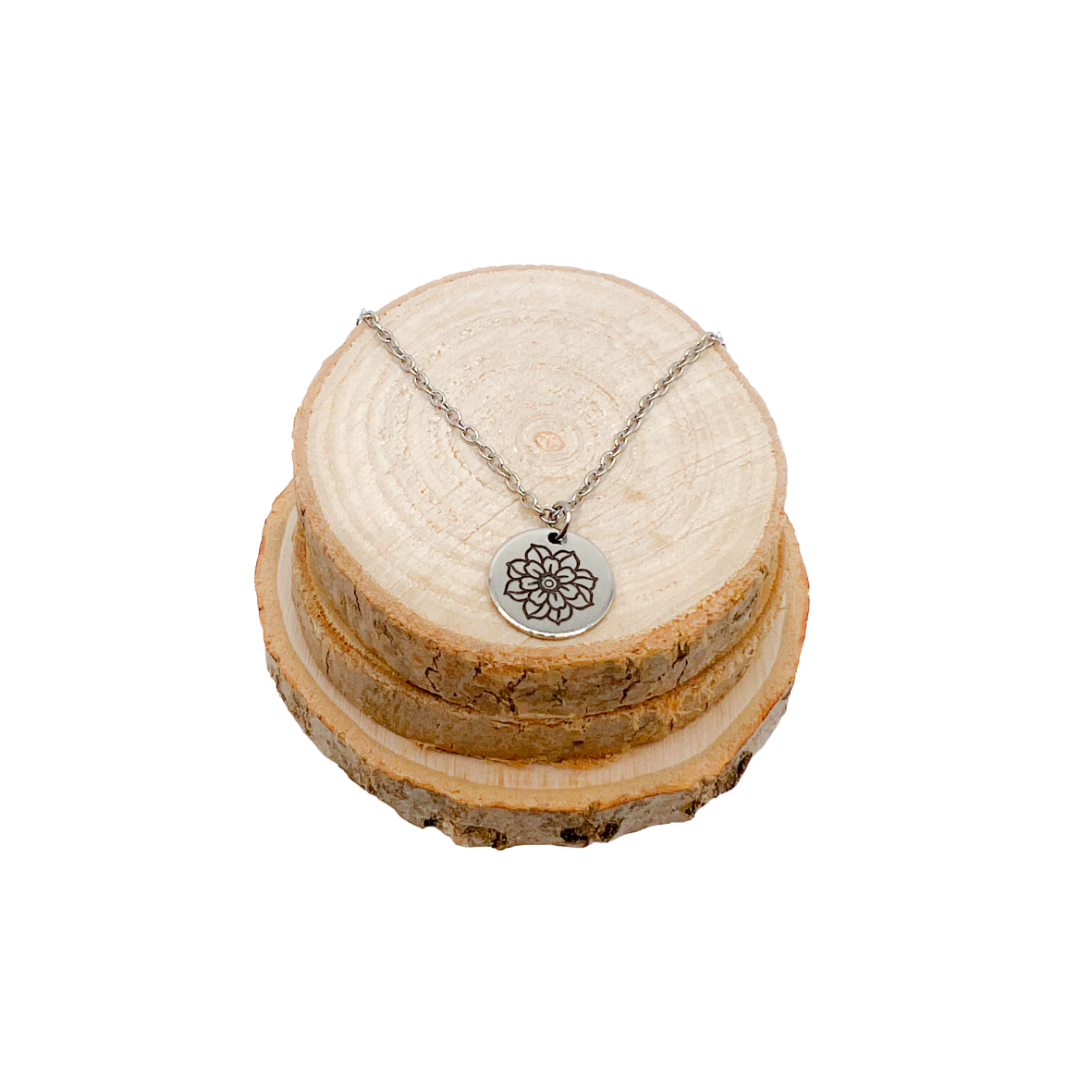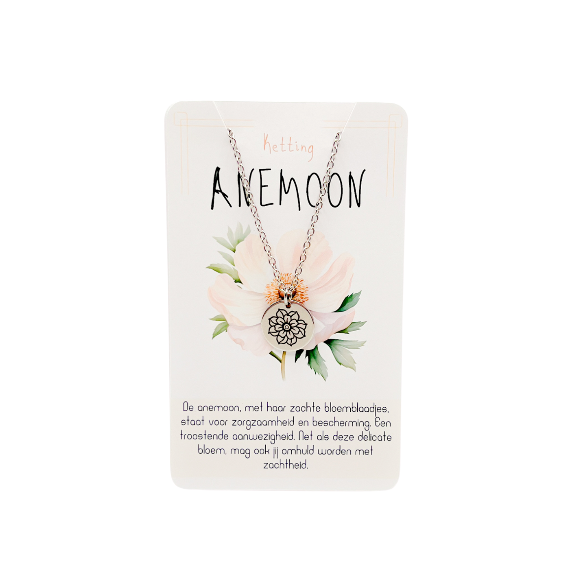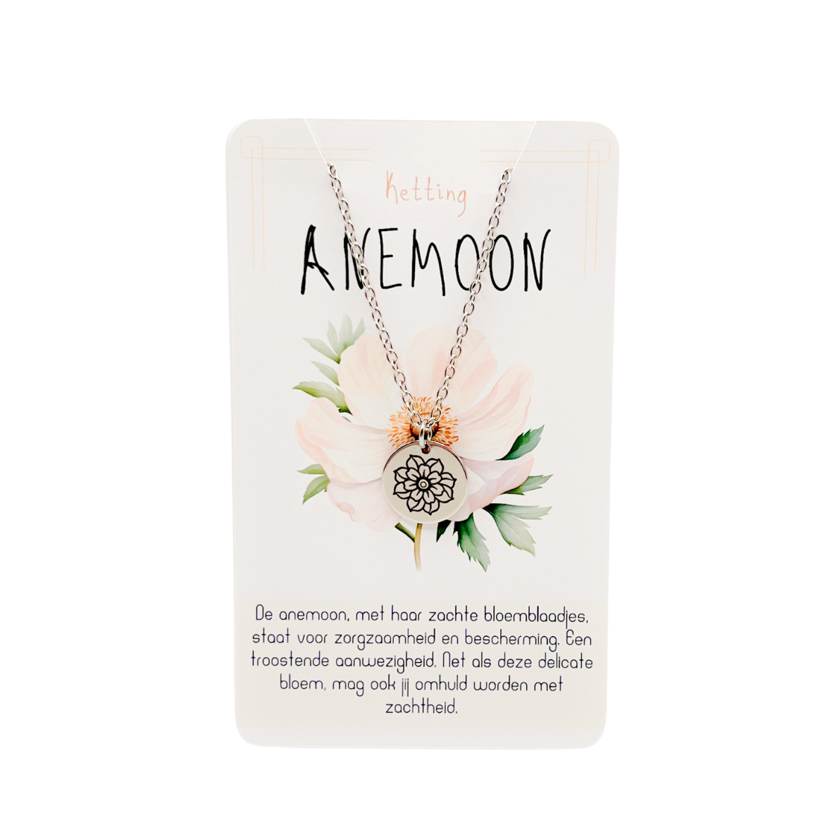Deze zilverkleurige ketting met een rond bedeltje, gegraveerd met een anemoon, staat symbool voor zorgzaamheid en bescherming. Haar zachte bloemblaadjes doen denken aan troost en tederheid.