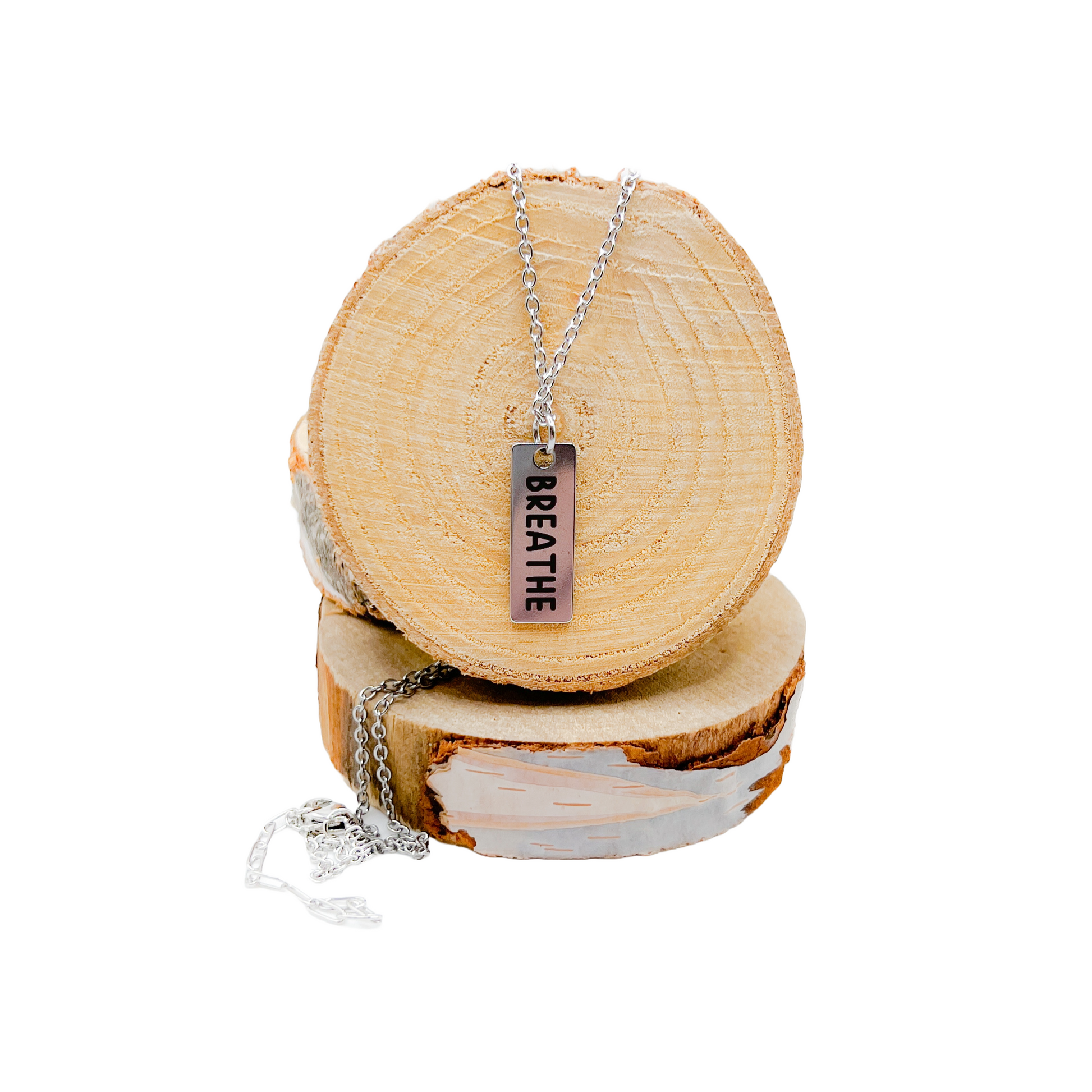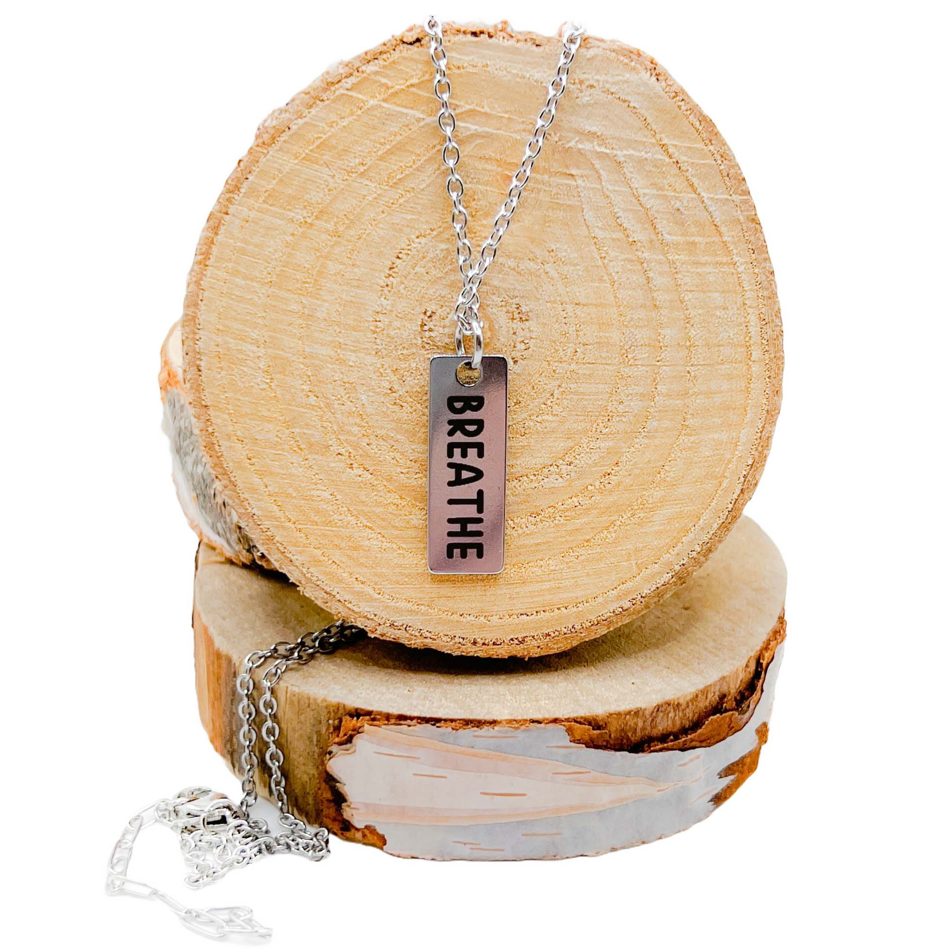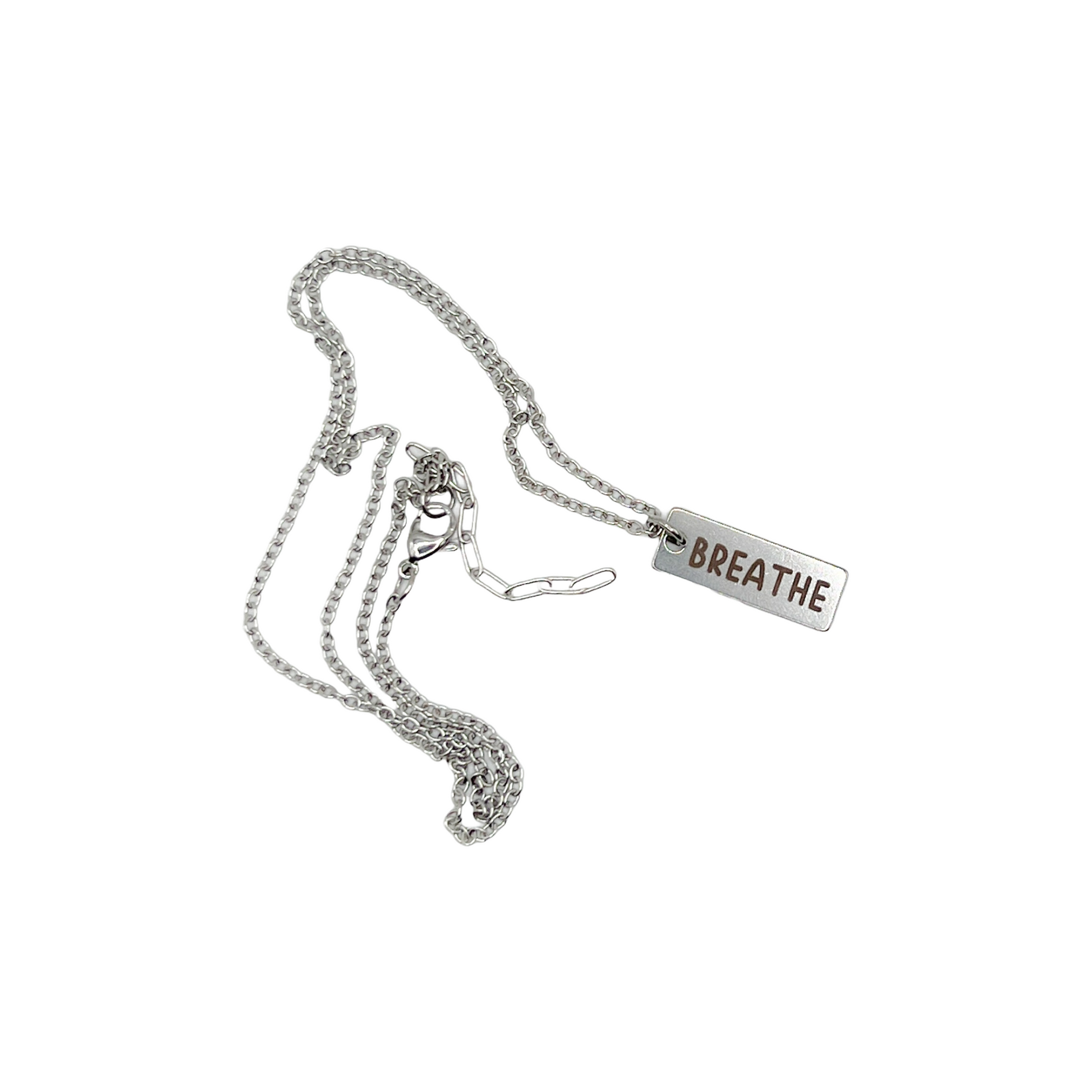 Minimalistische zilveren ketting met de subtiele boodschap "breathe". De tekst is gelaserd op het bedeltje.