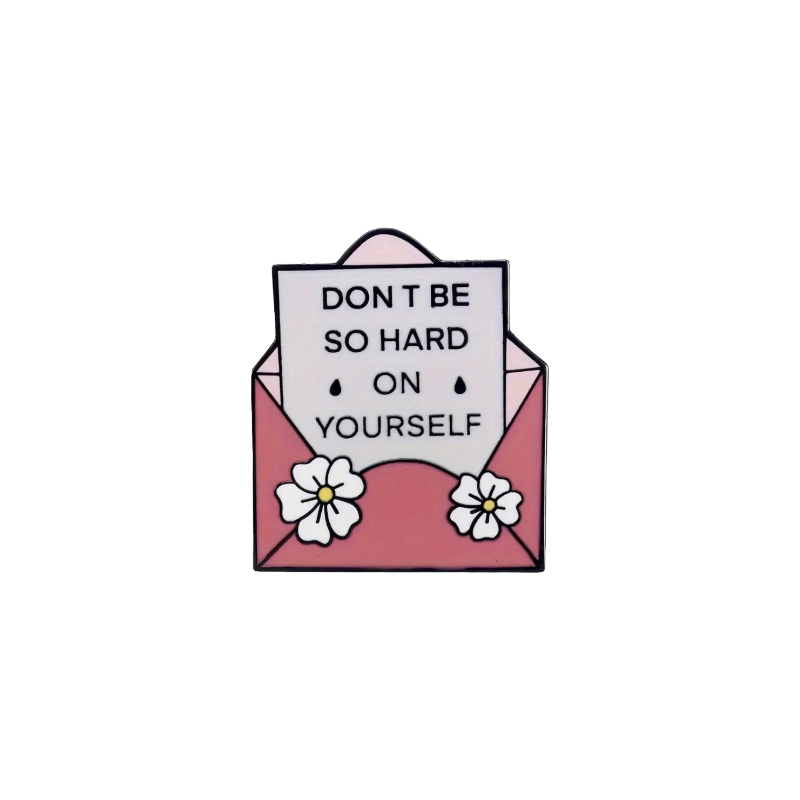 Roze pin met de tekst don't be so hard on yourself.