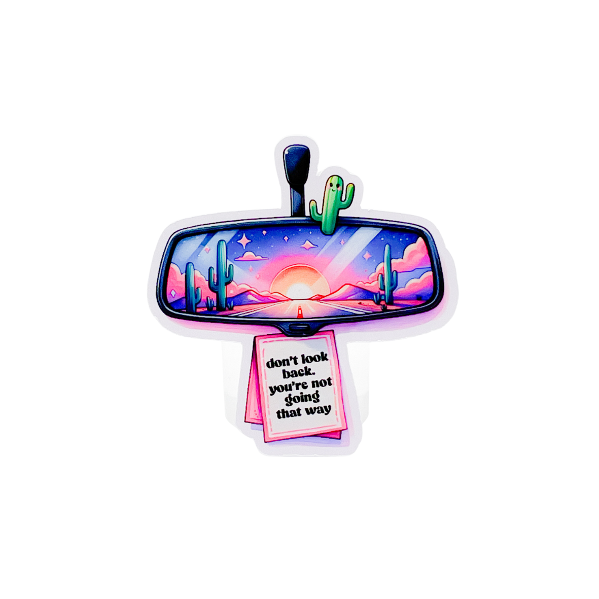 Gekleurde sticker met de tekst ''don't look back. You're not going that way''.