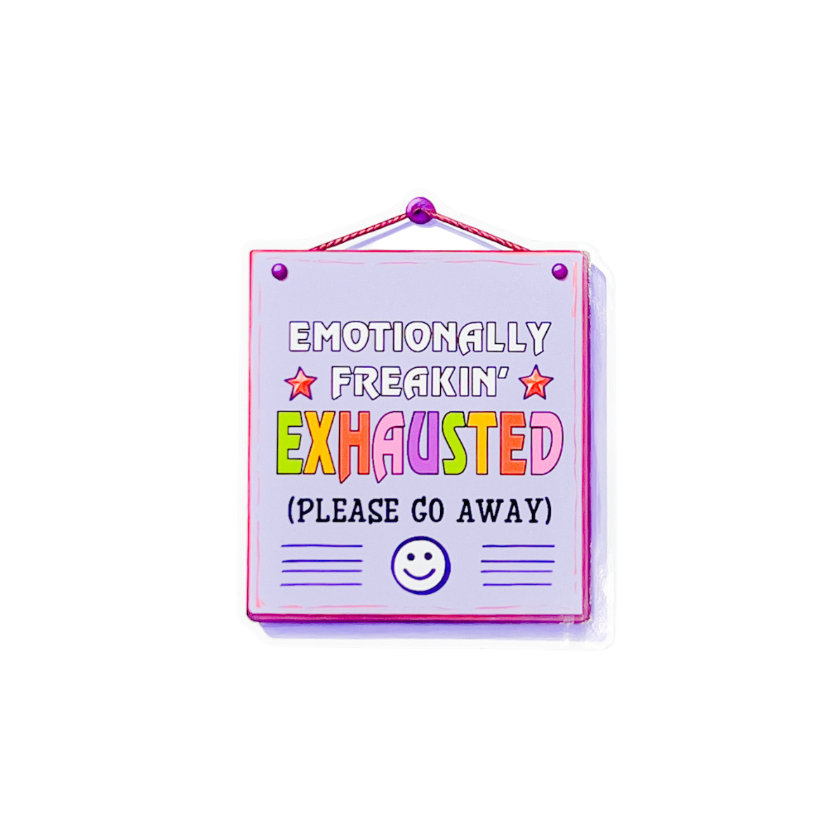 Gekleurde sticker met de tekst ''Emotionally freaking exhausted, please go away''.