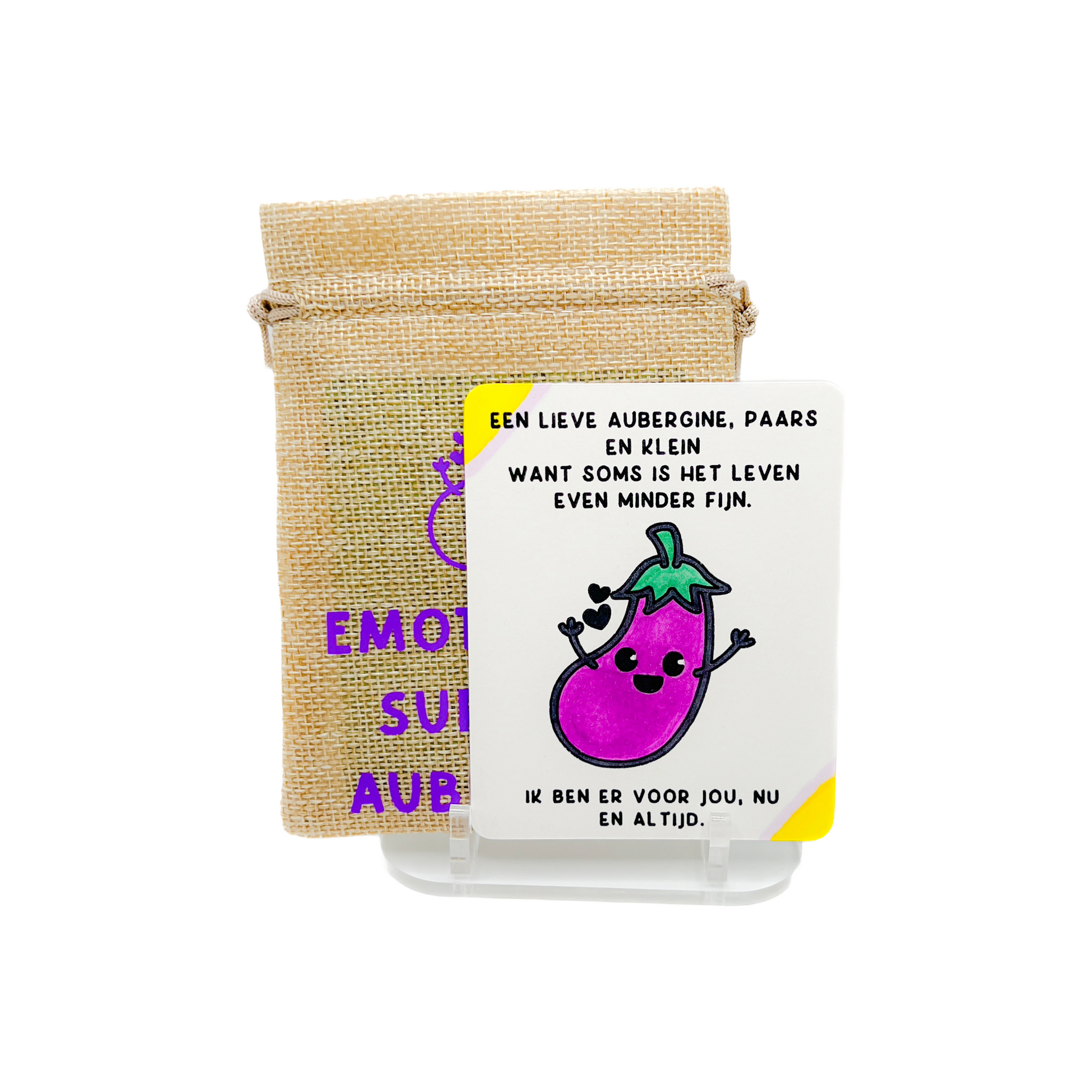 De emotionele support aubergine, altijd daar voor je – stil, zonder oordeel en knuffelbaar. Perfect als luisteraar, stressbal of troostende vriend.