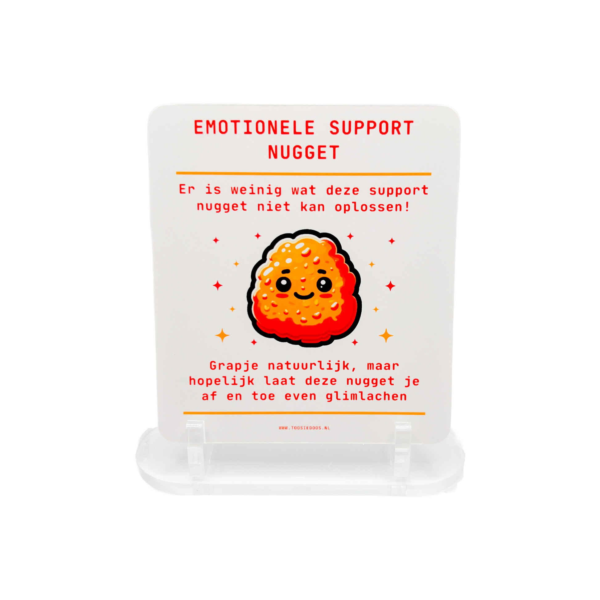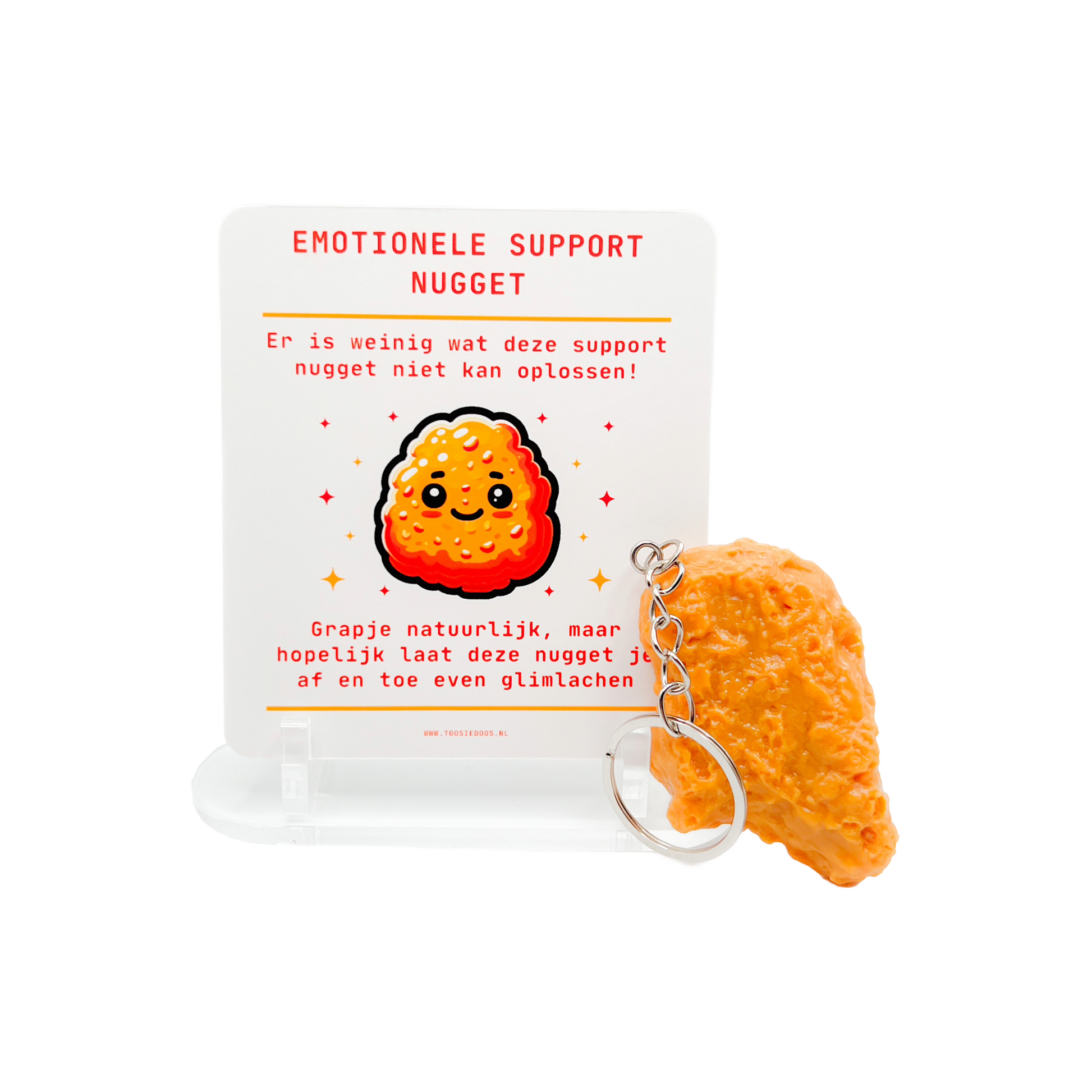 Deze grappige Emotionele Support Nugget is er voor jou of voor iemand die wel een glimlach kan gebruiken. Hang hem aan je sleutelbos, tas of etui. Hopelijk tovert hij, elke keer dat jij (of degene aan wie je hem geeft) ernaar kijkt, een kleine glimlach op het gezicht.