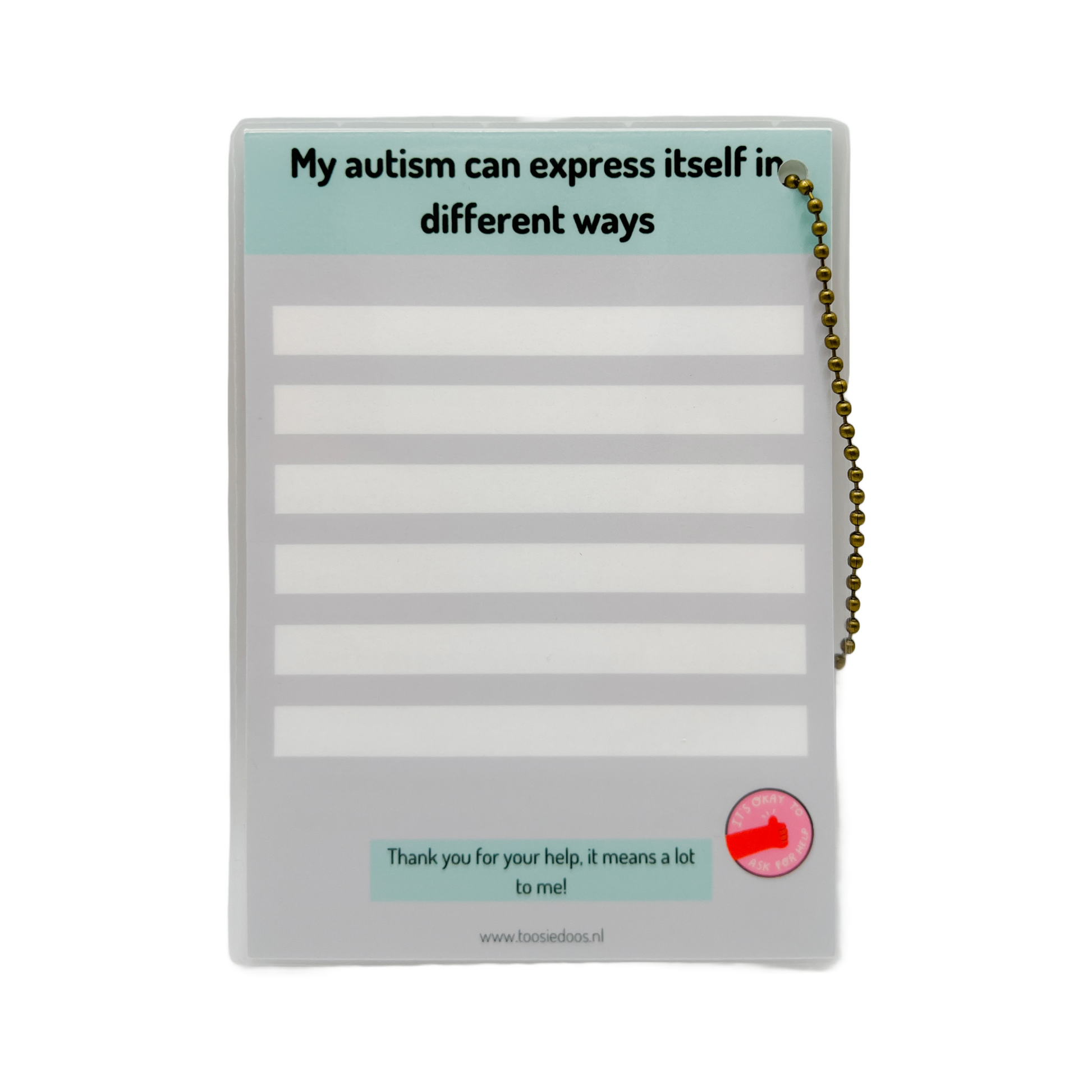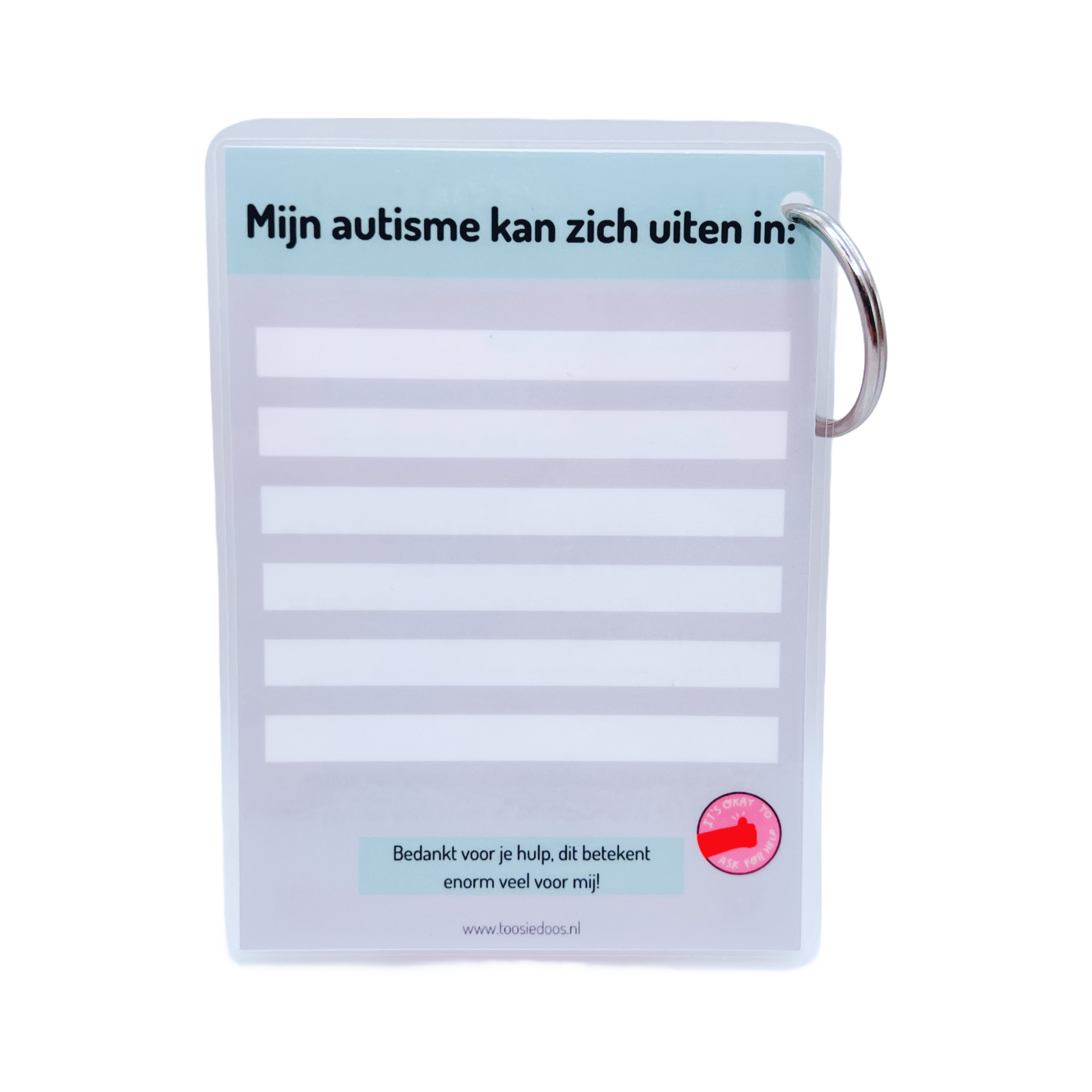 De achterkant met “hoe uit mijn autisme zich” is opzettelijk open gelaten, omdat het per persoon verschilt. Met watervaste stift kun je invullen hoe jouw autisme zich uit.