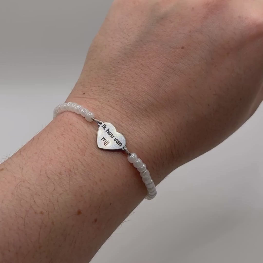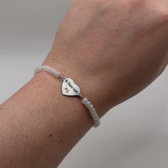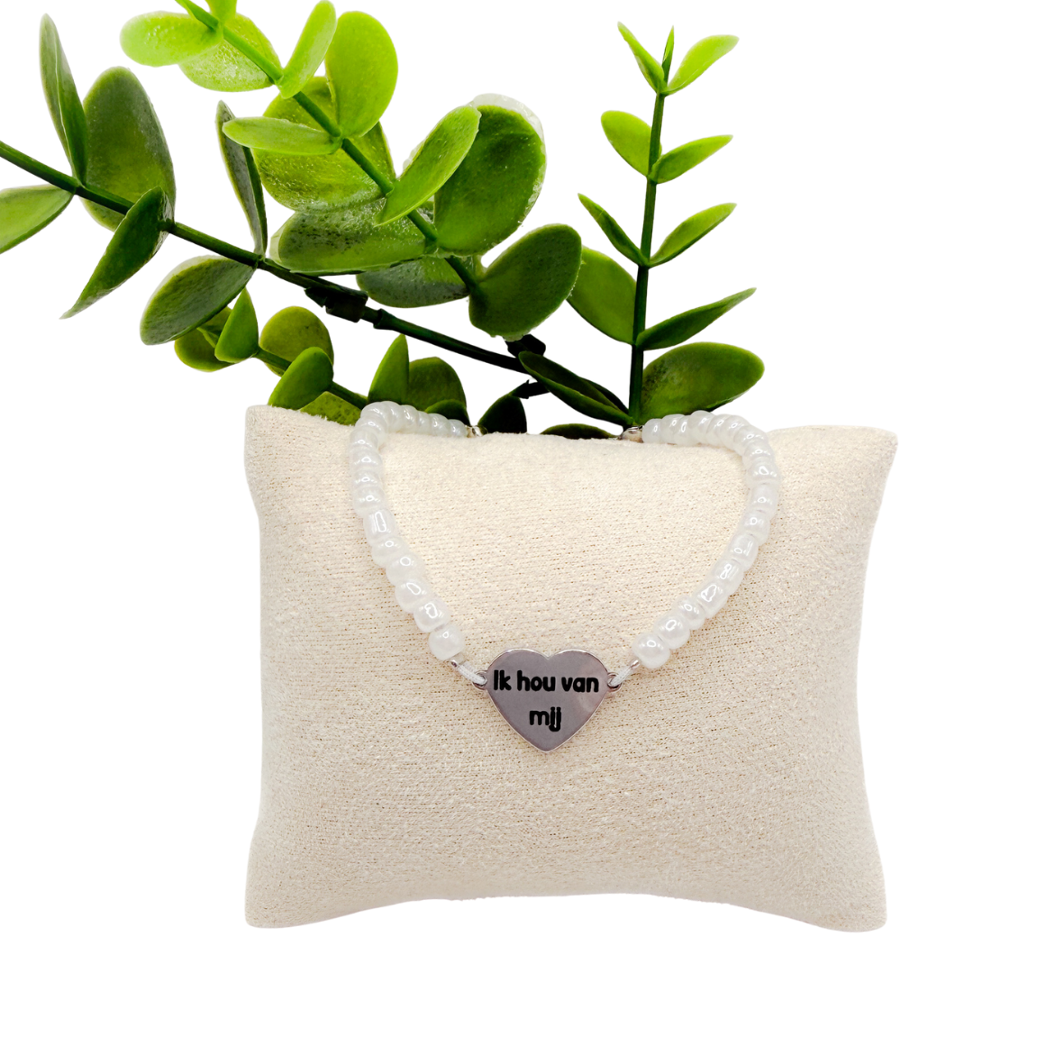 Een klein sieraad met een grote boodschap: deze armband heeft een bedel in het midden met de tekst “ik hou van mij”. De parelkleurige kralen en zilveren details maken hem zacht en liefdevol, terwijl de woorden je eraan herinneren om even bij jezelf stil te staan en jezelf een beetje extra aandacht te geven.