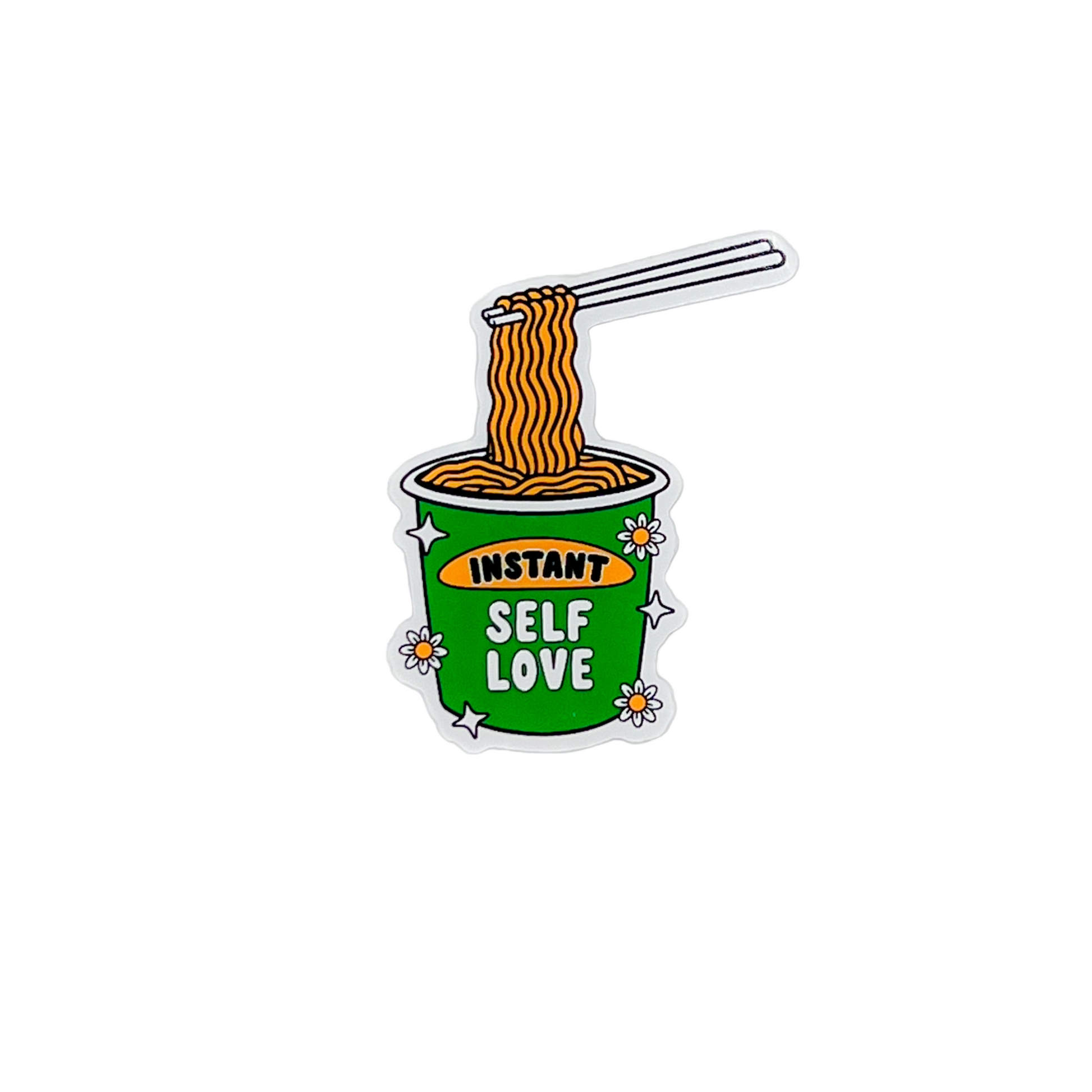 Grappige sticker in de vorm van een bakje instant noodles met de tekst ''Instant self love''