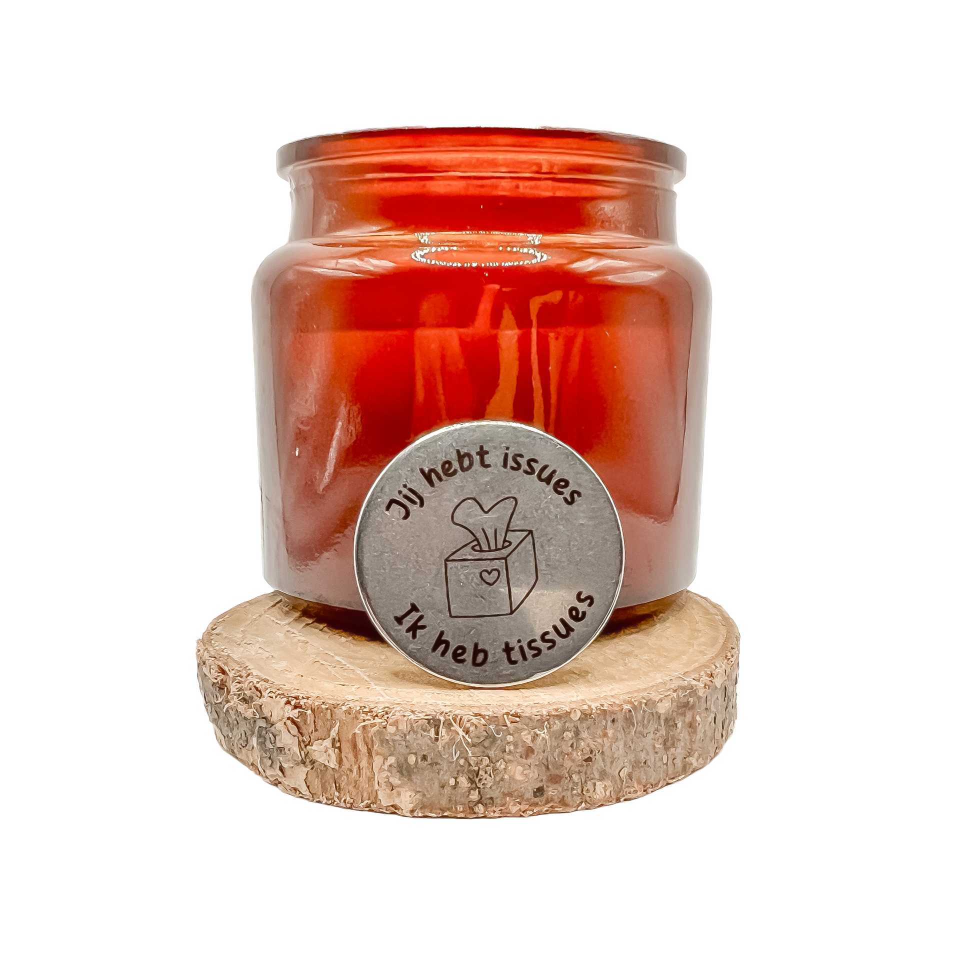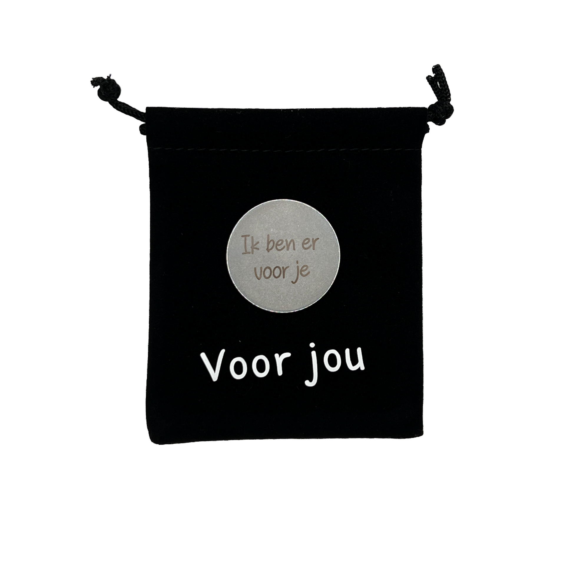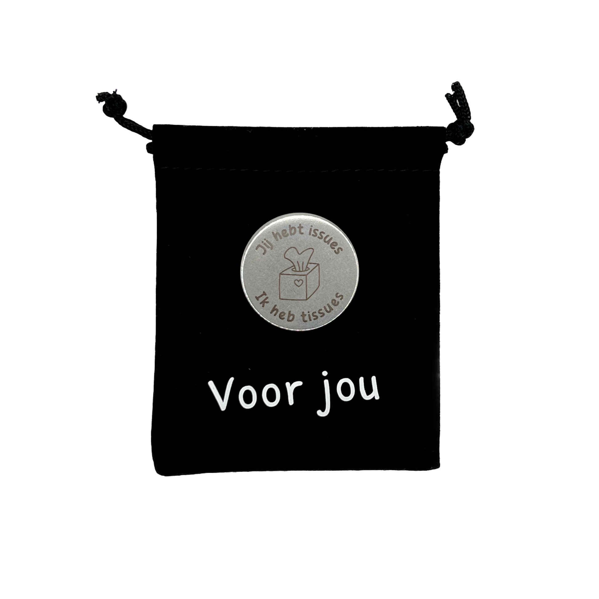 De munt is 32mm en aan beide kanten gegraveerd met de tekst: Jij hebt issues ik heb tissues en ik ben er voor je. De munt komt in een zwart fluweel zakje met de tekst voor jou.