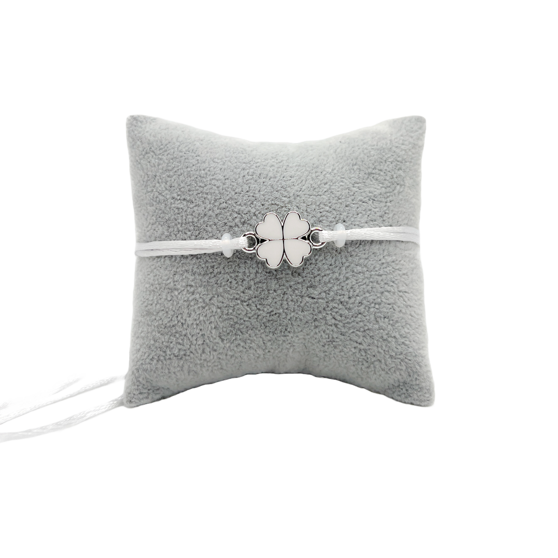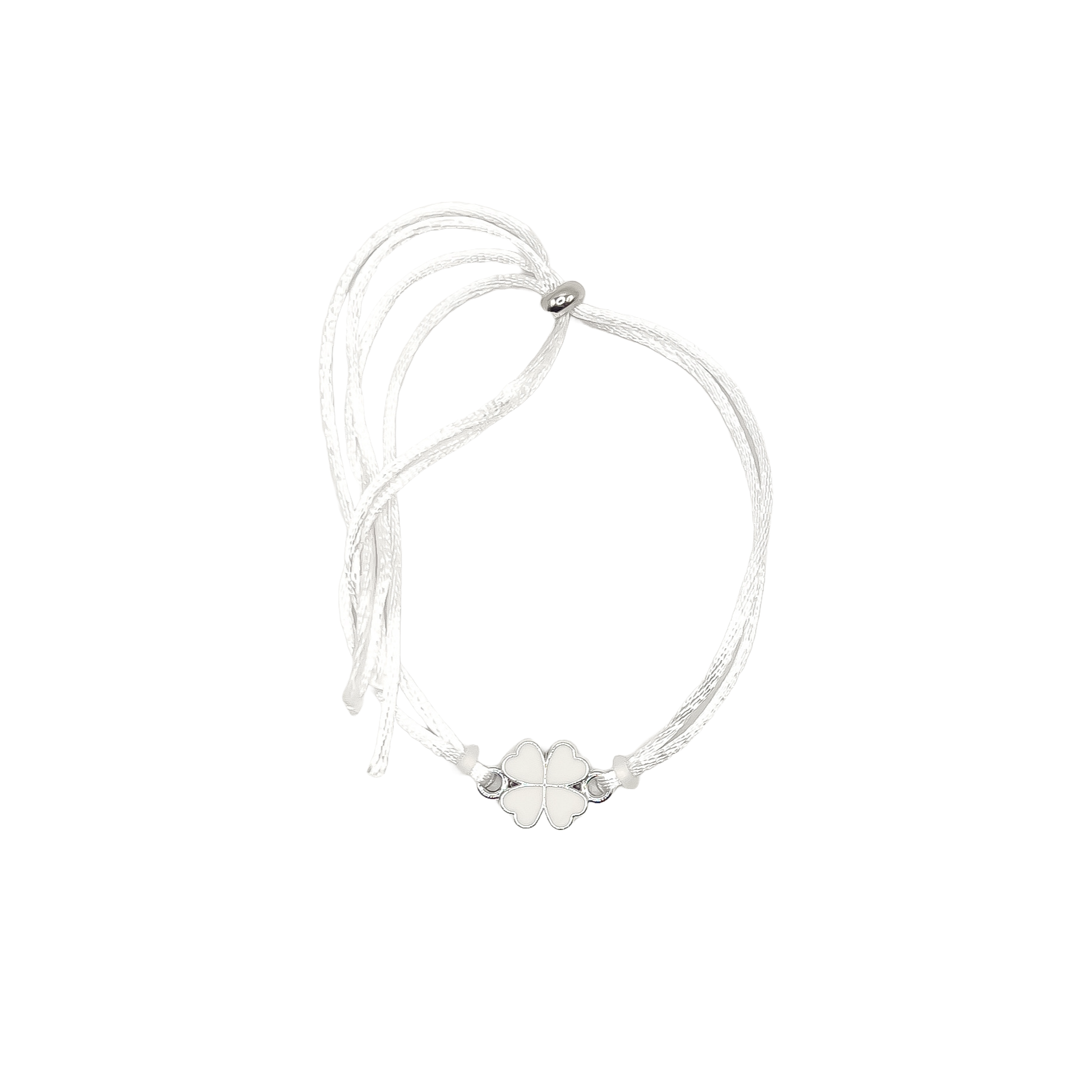 Deze armband is een klein stukje geluk om je pols. Het zachte witte lint draagt comfortabel, terwijl de witte en zilverkleurige klavertje-vier-bedel een leuk contrast geeft.