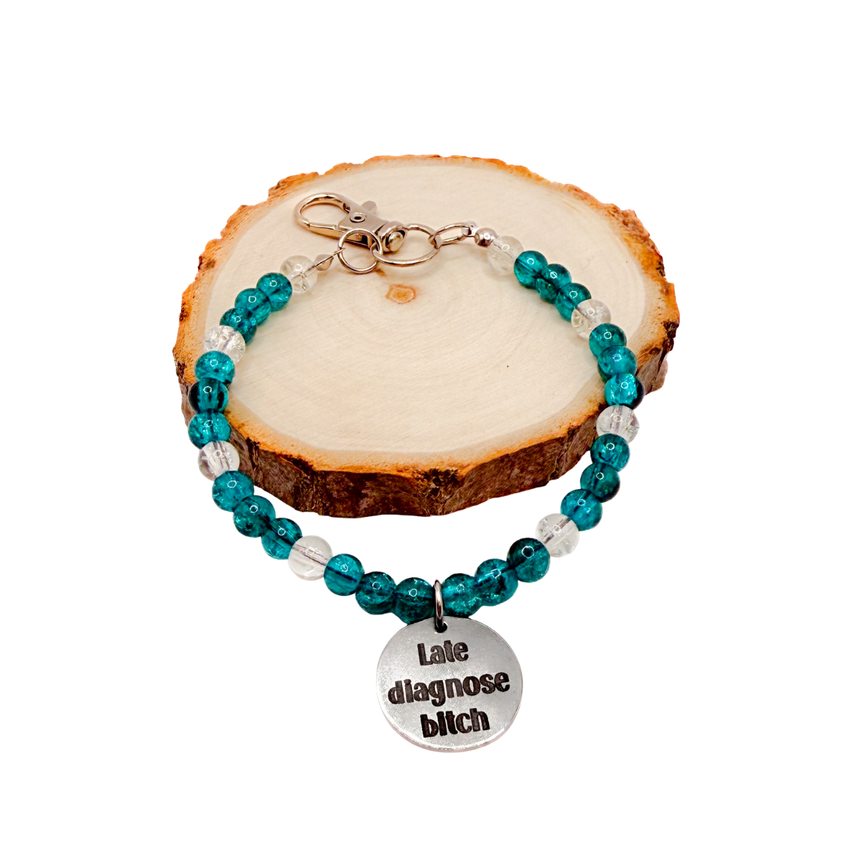 Deze handgemaakte sleutel- of tashanger is een kleine dosis herkenning om altijd bij je te dragen. De crackle-kralen in emeraldblauw en helder glas vangen het licht prachtig op, terwijl de gegraveerde bedel met late diagnose bitch een knipoog geeft naar de weg die je hebt afgelegd. Licht in gewicht, afgewerkt met zilverkleurige hardware en gemaakt met zorg — een eerlijke, krachtige reminder dat jouw verhaal er mag zijn.