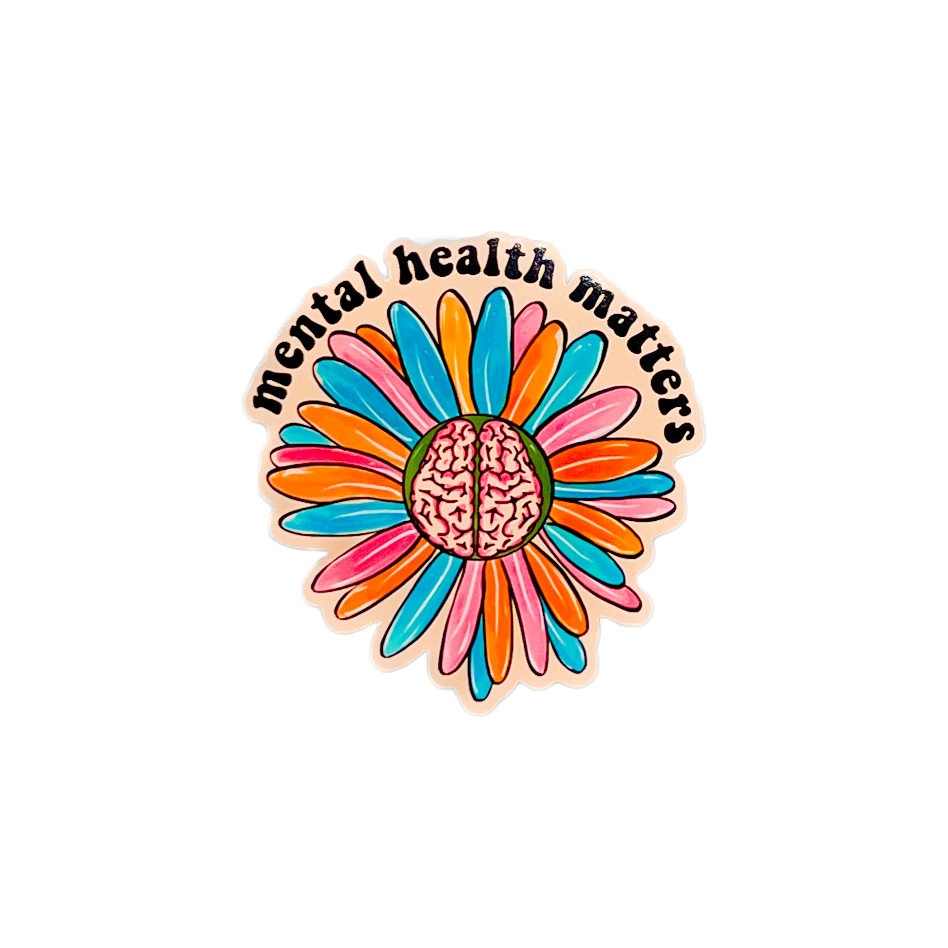 Gekleurde sticker in de vorm van een zonnebloem met de tekst ''mental health matters''