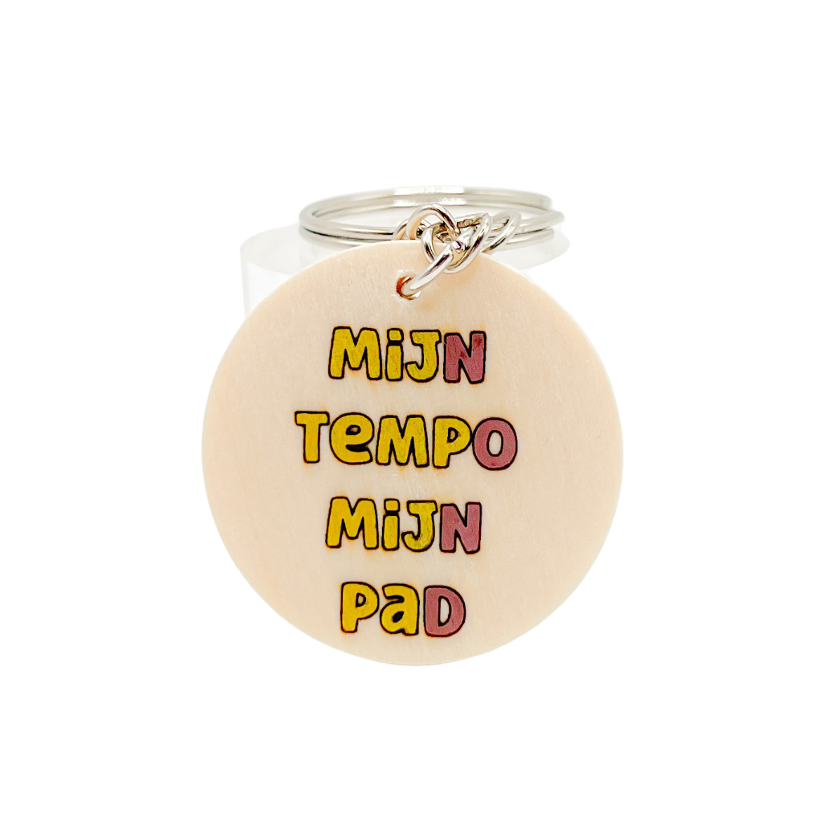 Houten sleutelhanger, gegraveerd en hand geschilderd met de tekst; mijn tempo, mijn pad.