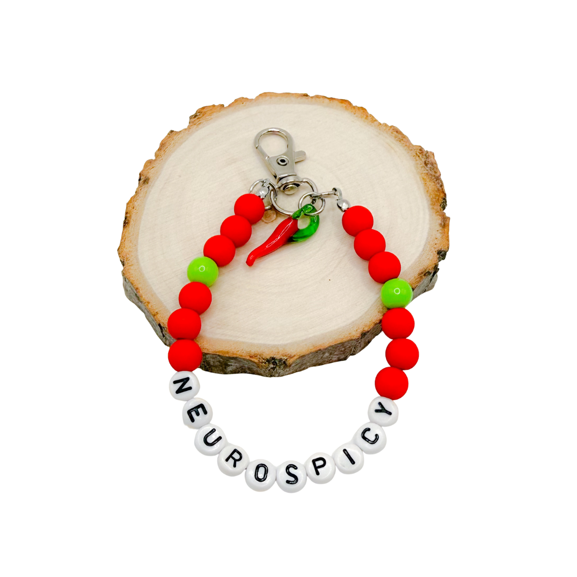 Deze handgemaakte sleutelhanger met letterkralen vormt het woord neurospicy—een speelse knipoog voor iedereen die zichzelf hierin herkent. De rode kralen met twee lichtgroene accenten geven hem een frisse, vrolijke look. Aan de hanger zit ook een glazen rode peper als grappige extra touch die de tekst nog nét iets leuker maakt. Luchtig, positief en helemaal passend binnen mentale gezondheid: een klein accessoire dat gewoon leuk is om bij je te dragen.