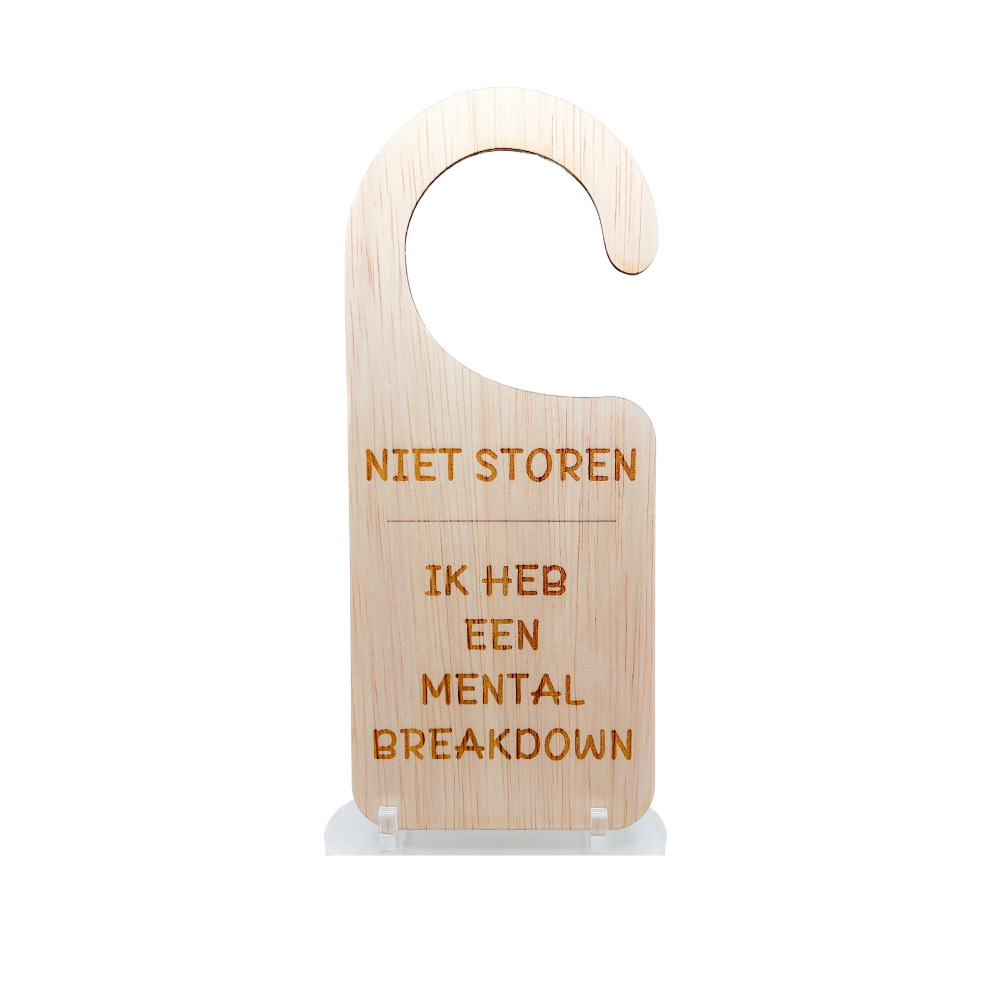 Soms is het leven even een rommelige boel, en dat hoeft geen geheim te zijn. Met deze handgemaakte houten deurhanger met de tekst "Niet storen, ik heb een mental breakdown" zeg je precies waar het op staat. Subtiel? Nee. Duidelijk? Absoluut.