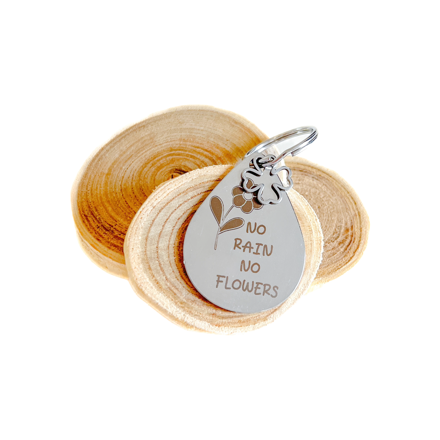 Sommige dagen zijn zwaar, maar bloemen groeien niet zonder regen! Onze sleutelhanger 'No rain, no flowers' is een herinnering dat moeilijke dagen nuttig kunnen zijn voor de toekomst.