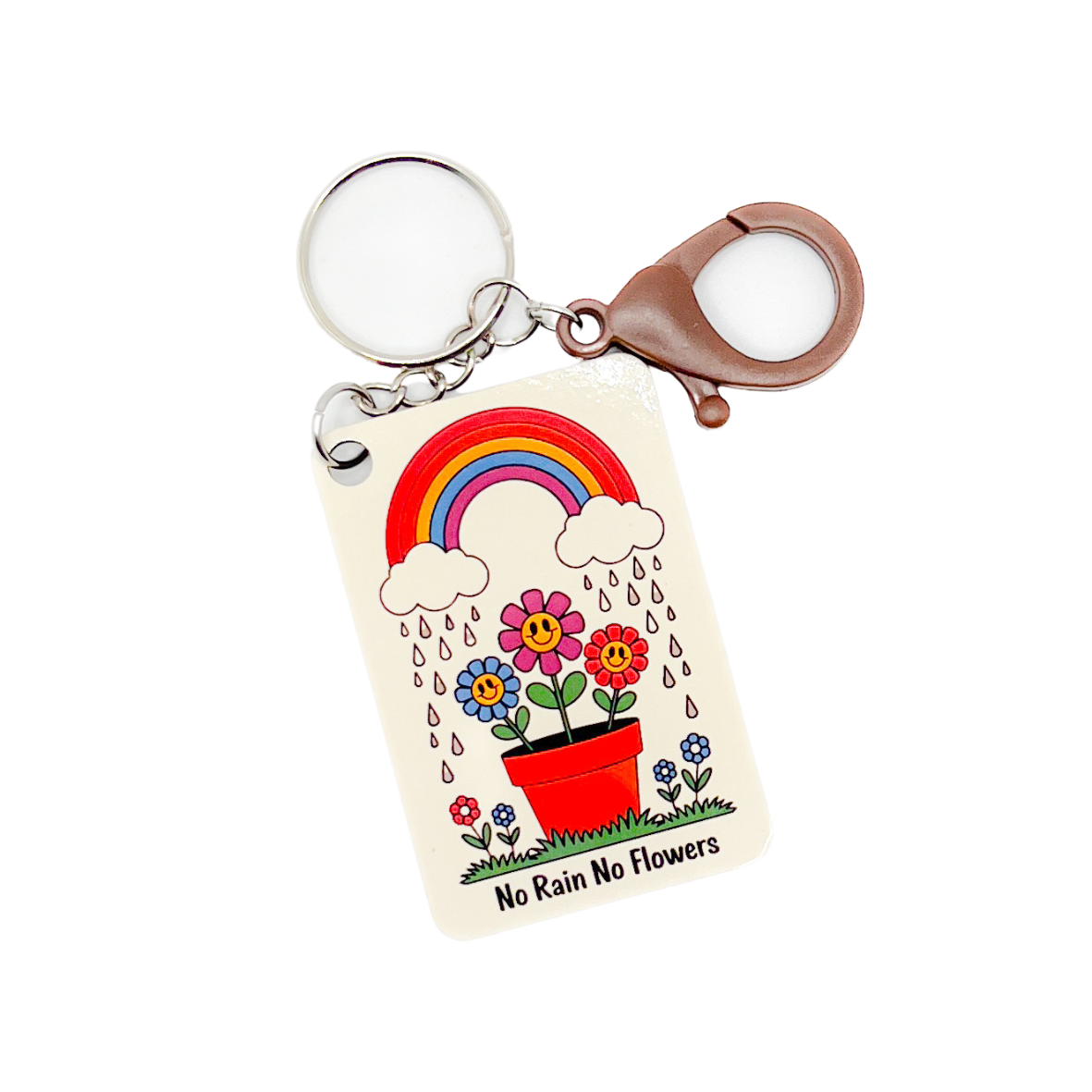 Deze kleurrijke sleutelhanger met regenboog, wolkjes, bloemen en de tekst "No rain, no flowers" is meer dan alleen leuk – het is een reminder. Soms heeft je leven gewoon wat regen nodig om te kunnen bloeien. Net als bloemen water nodig hebben, groeien wij ook van tranen, tegenslagen (en af en toe een breakdown).
