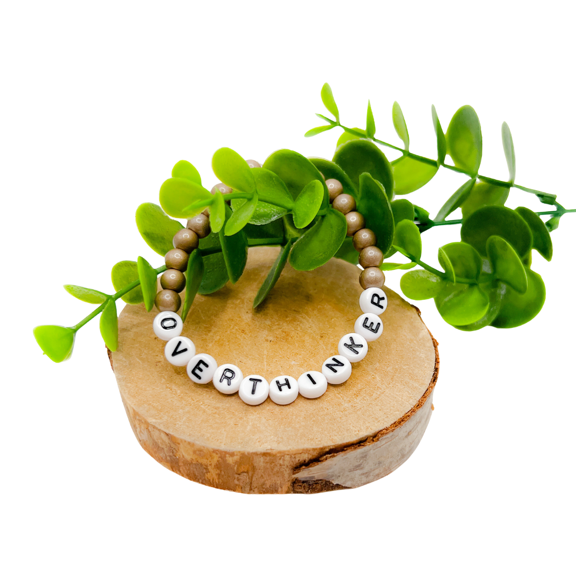 Altijd nét een gedachte te veel? Deze handgemaakte armband met glanzende taupe kralen en de tekst “Overthinker” is een grappig en herkenbaar sieraad voor mentale gezondheid en zelfzorg. Verkrijgbaar in twee maten (zie de matentabel bij de laatste foto).