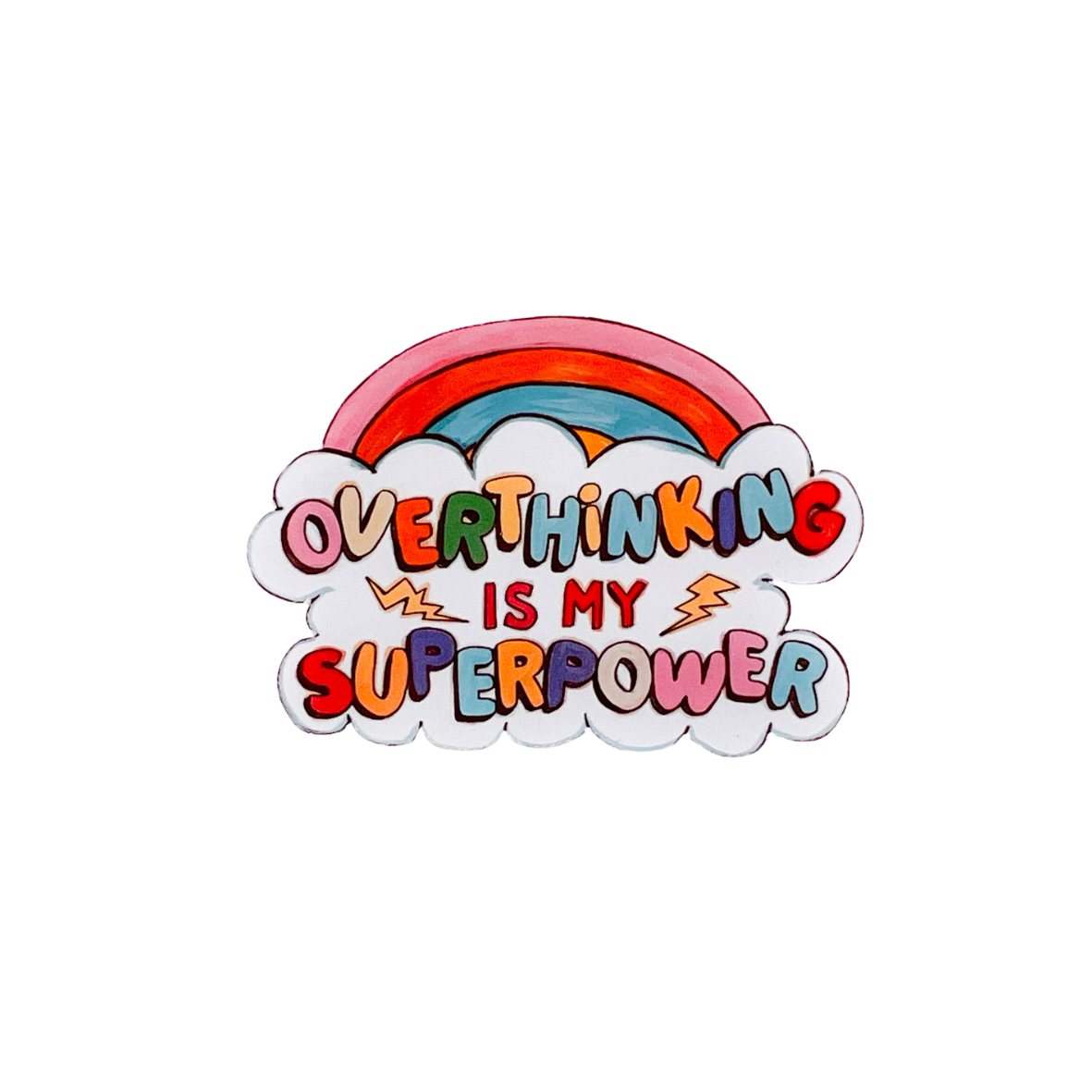 Regenboog sticker met de tekst ''Overthinking is my superpower''.