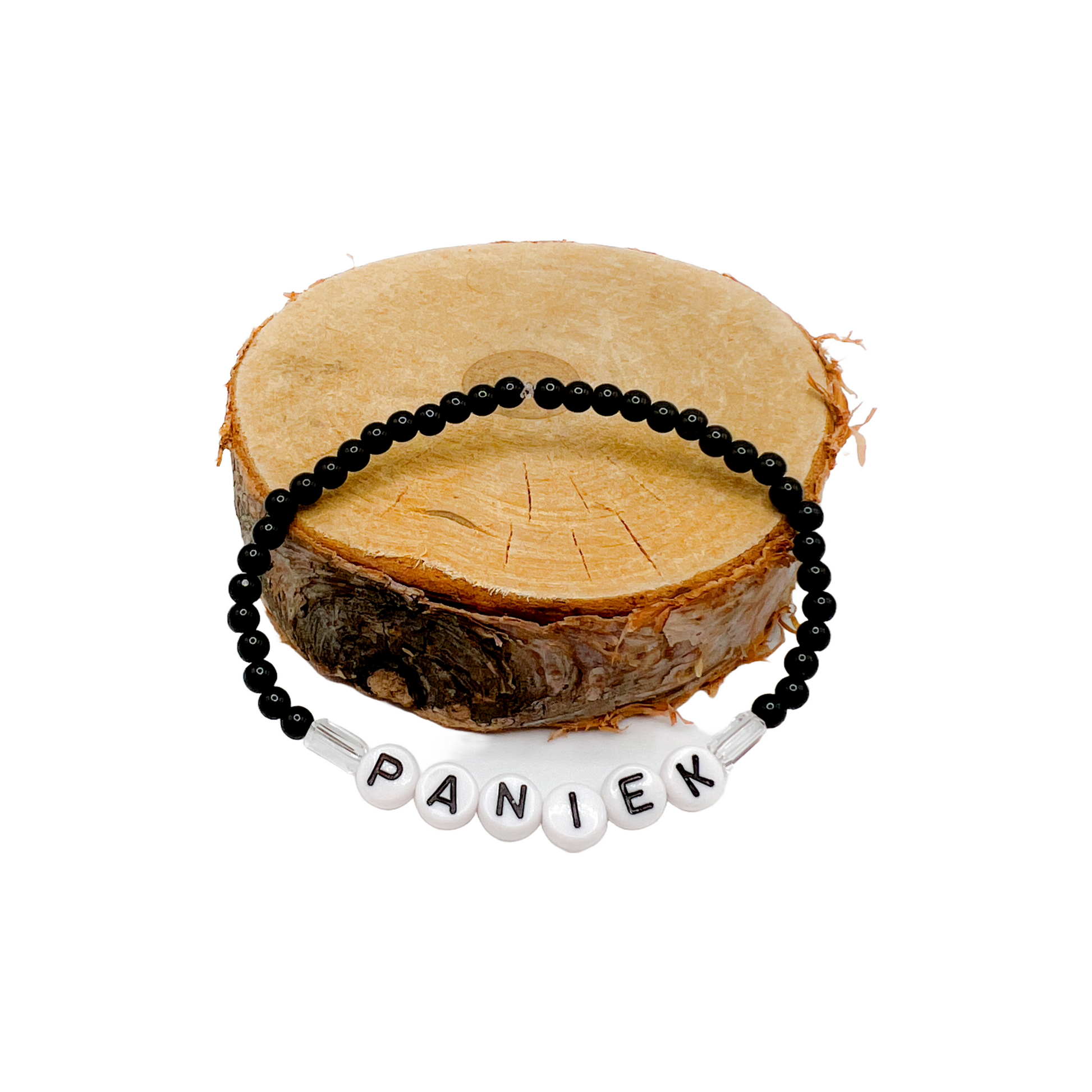 Armband van zwarte kralen met de tekst ''Paniek''.