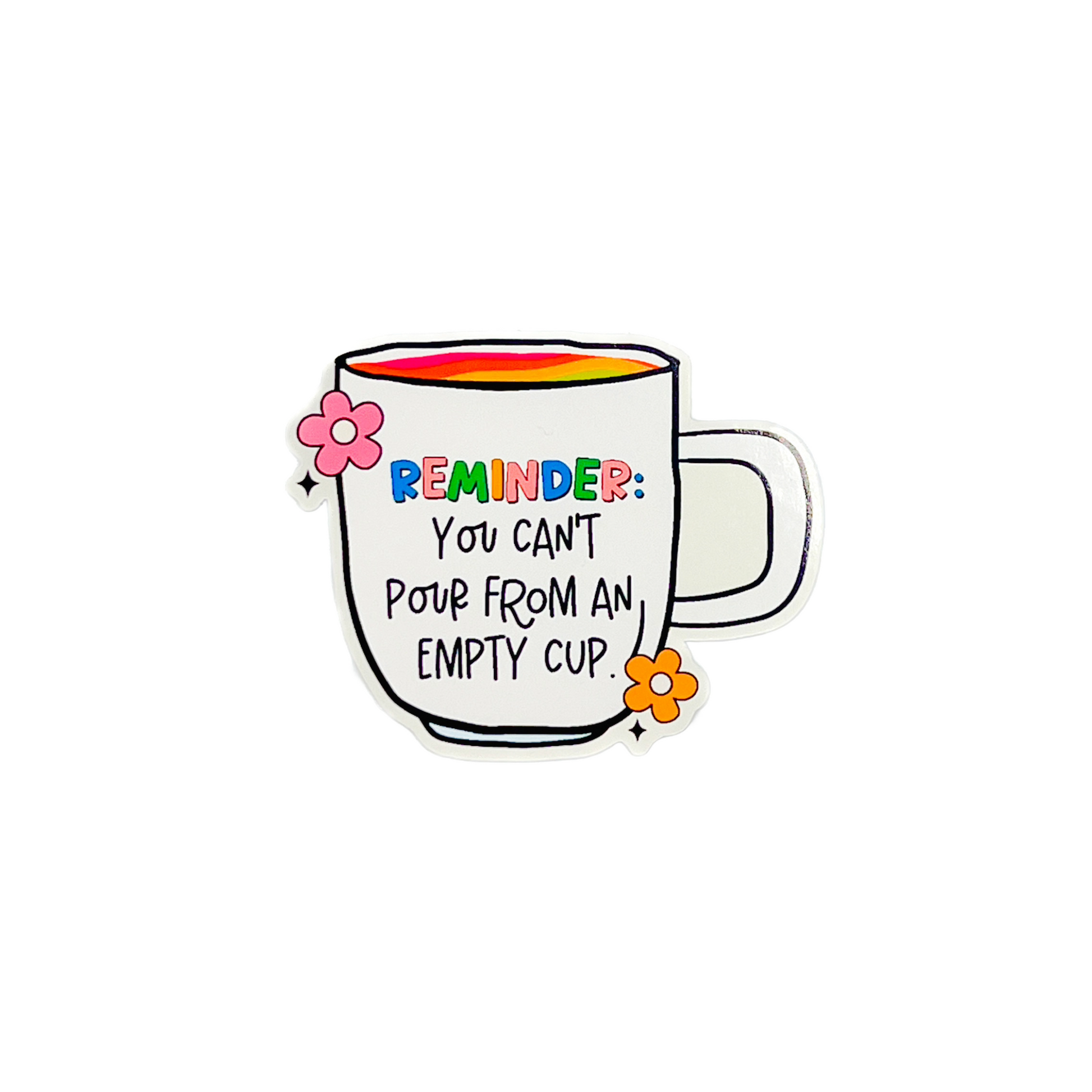 Sticker in de vorm van een koffie/thee kop met de tekst ''Reminder: you can't pour from an empty cup''.