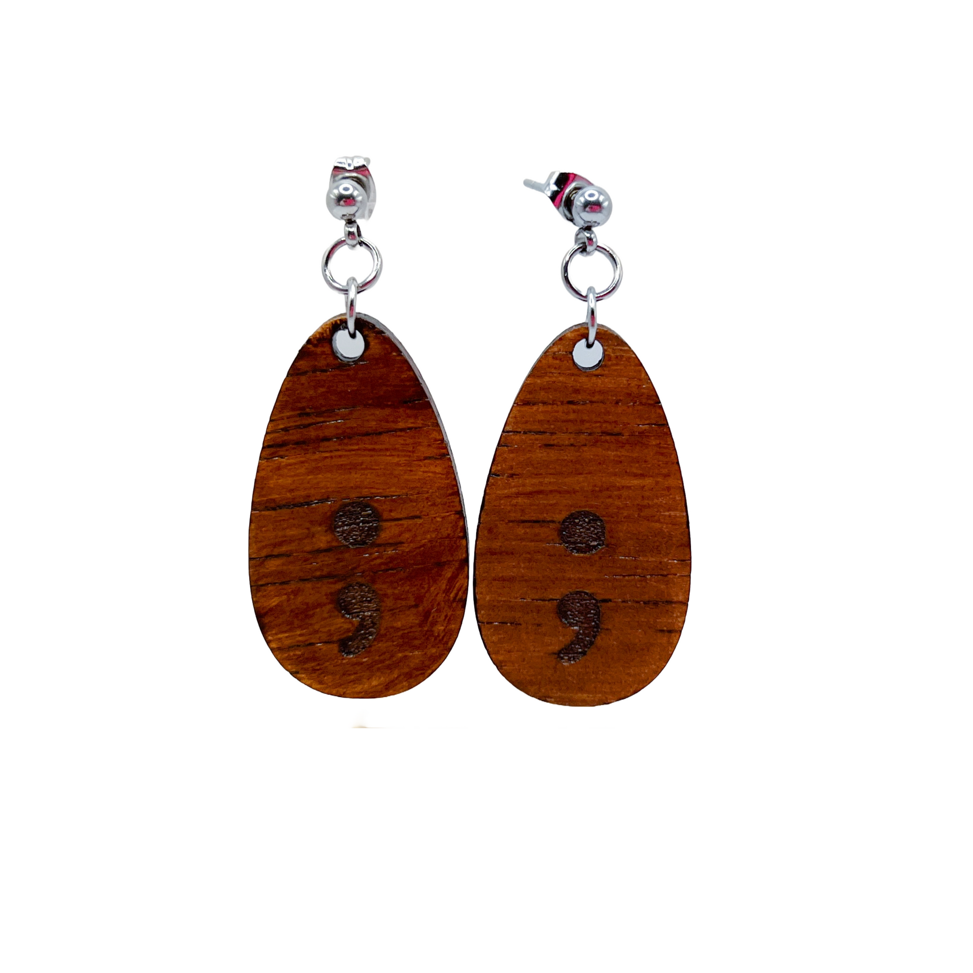 Handgemaakte oorbellen, in druppel vorm, met het semicolon teken gegraveerd. De oorbellen zijn gemaakt van hout en afgemaakt met een donkerbruine beits. De oorbellen dragen heerlijk licht en voel je bijna niet zitten.