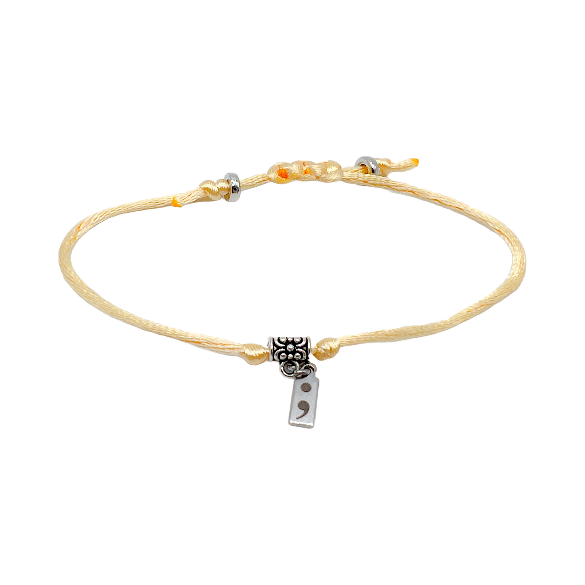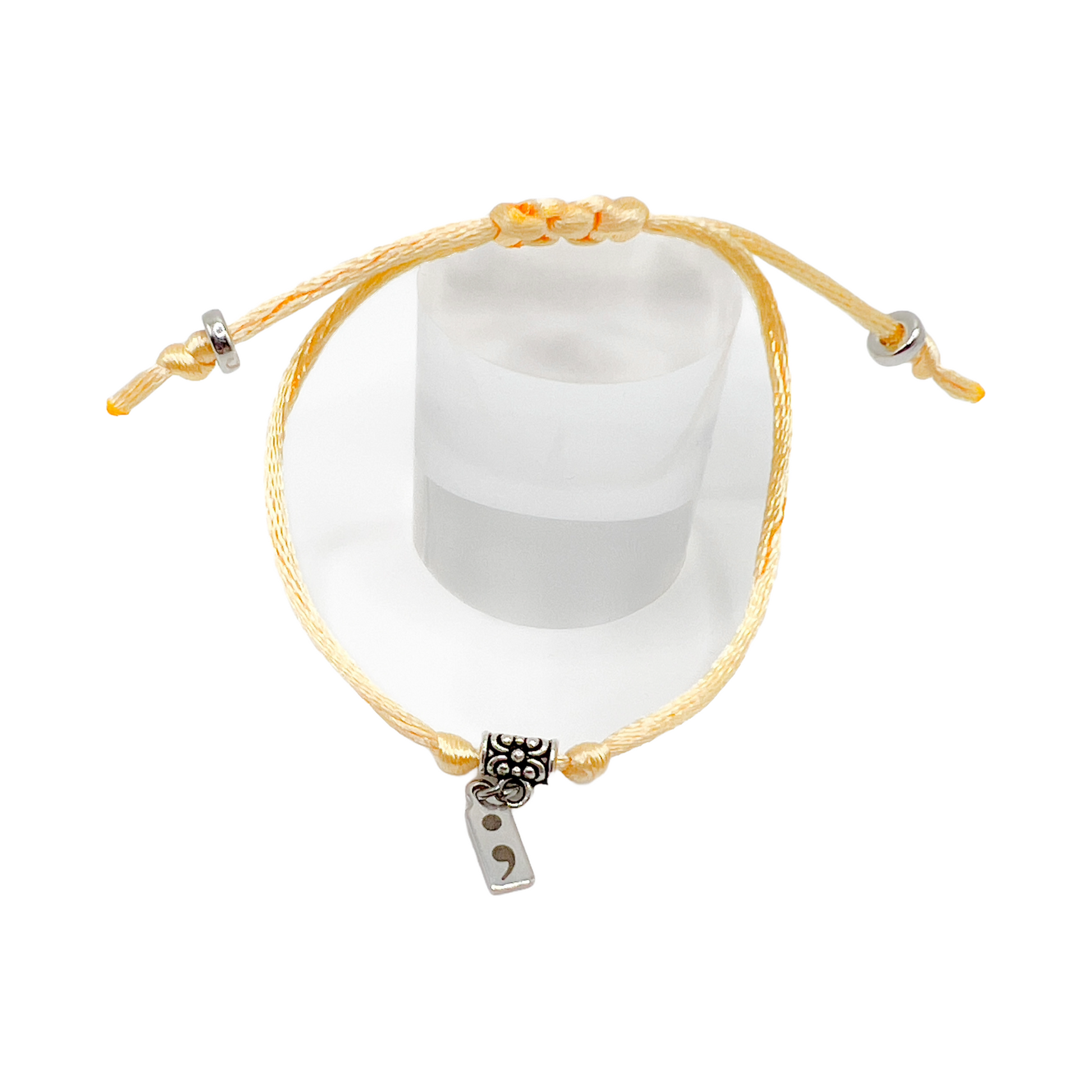 Deze armband met een zacht satijnen bandje in een prachtige nude-oranje tint heeft een bedel met het semicolon-teken – een symbool van kracht en hoop. Het semicolon-teken staat voor het moment waarop iemand in het leven doorgaat, opnieuw begint of kiest voor zichzelf. Het is een geheugensteuntje dat het verhaal nog niet voorbij is.