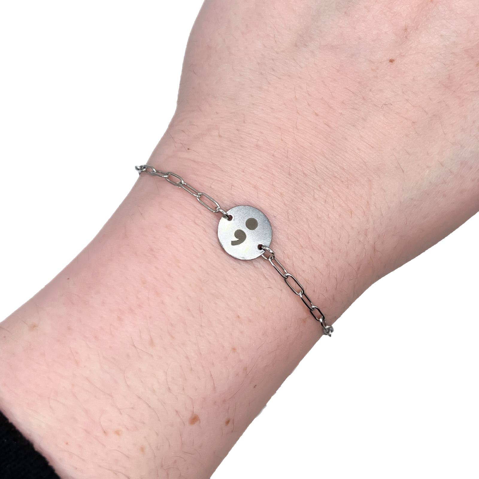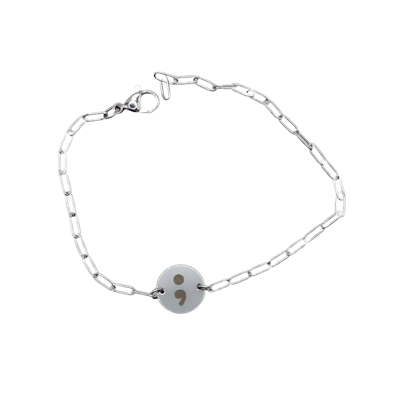 Prachtig minimalistische armband. Bedel is gegraveerd met het semicolon teken. Waar het semicolon teken voor staat is voor iedereen verschillend. Denk aan: een nieuw begin, overleven, het hebben overleefd, hoop of dat jou leven niet stopt maar doorgaat, morgen heeft jou nodig.