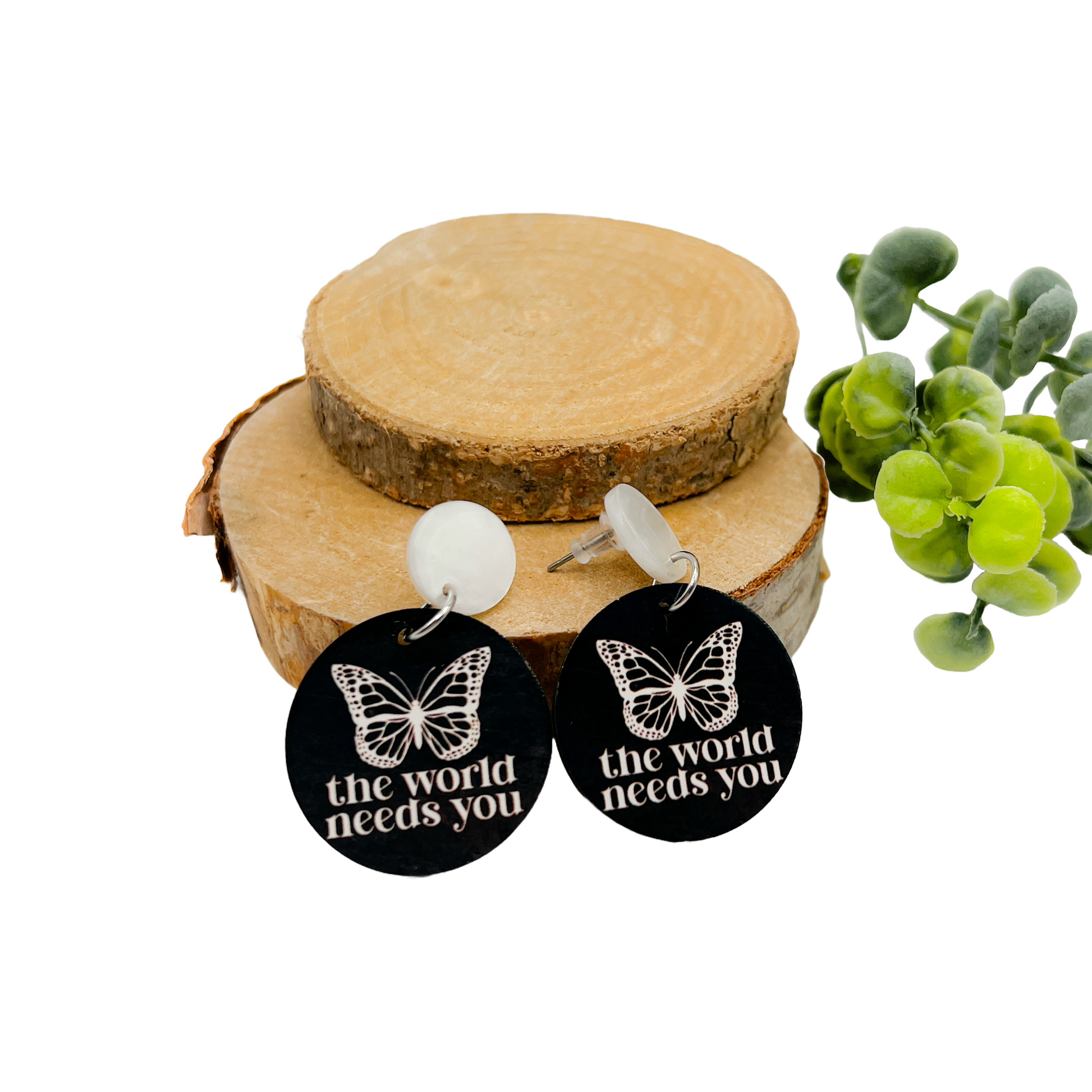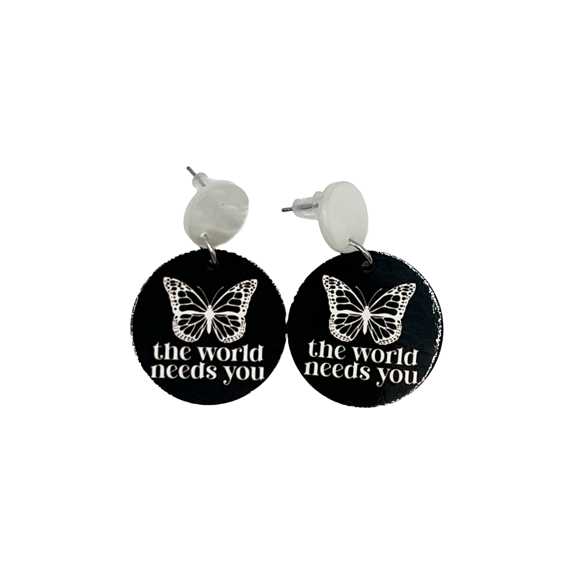 Oorbellen met de tekst ''the world needs you''. De zwarte marmerlook met de witte knopjes geven een mooi contrast. Ze zijn gemaakt van mdf waardoor ze heerlijk licht dragen.