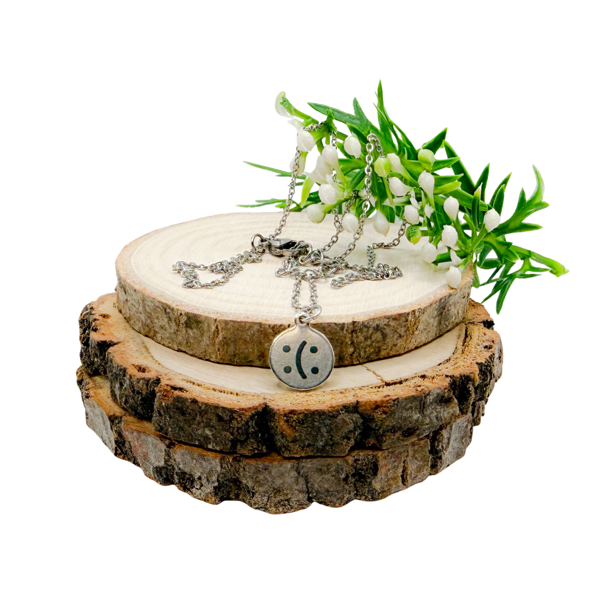 Deze zilveren ketting vertelt een verhaal van tegenstellingen en grote emoties. Aan de ketting hangt een bedel met het teken :(:, dat vaak wordt gebruikt bij persoonlijkheidsstoornissen zoals borderline of bipolair, maar ook symbool staat voor intense emoties in het algemeen. Want soms ligt blij dicht bij boos, en sterk dicht bij kwetsbaar.
