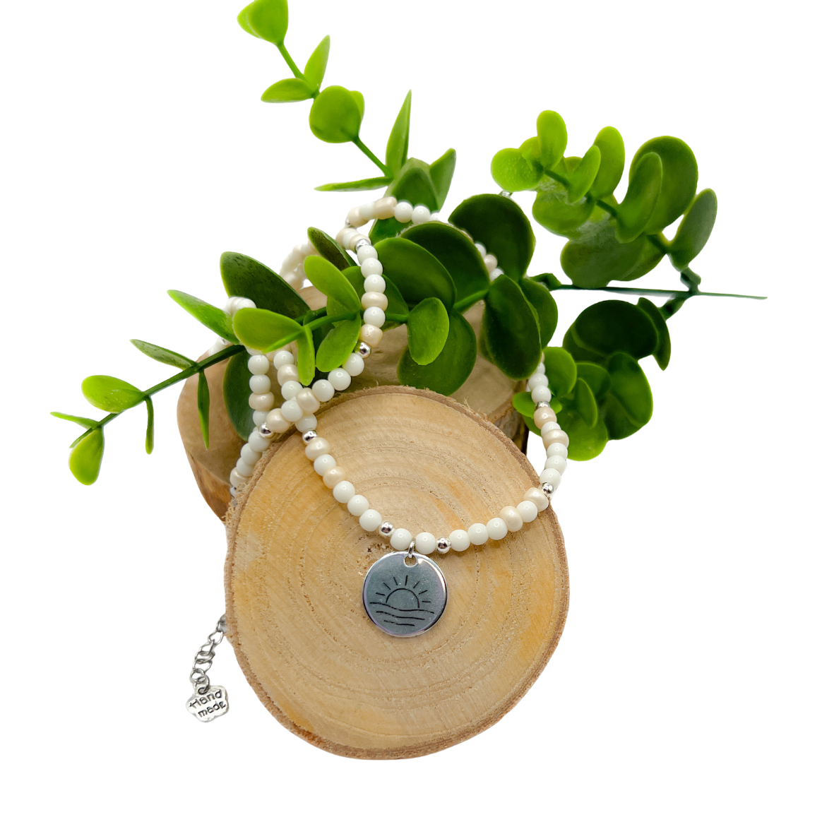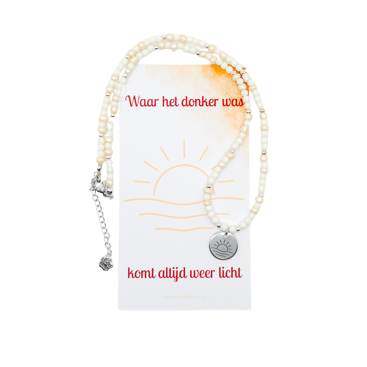 Deze handgemaakte ketting (45 cm + 5 cm verlengstukje) is samengesteld uit crèmekleurige kralen met zilveren accenten. Het middelpunt is een gegraveerde bedel met de afbeelding van de zonsopgang – een symbool van hoop, kracht en nieuwe beginmomenten.